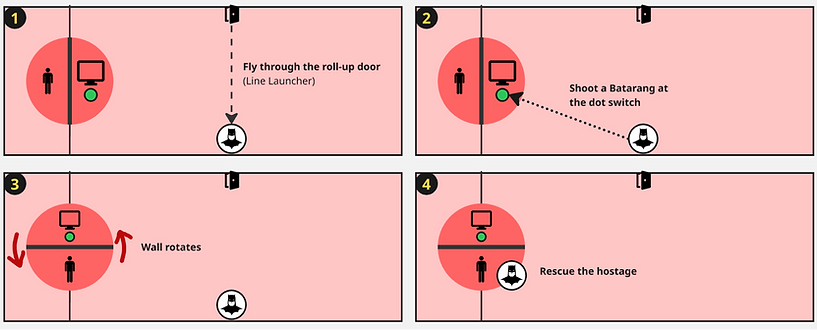 For the final phase, the goal is to bring everything together and pay off the earlier clues. When the player returns to the Main Room, the screens now form a clear question mark shape, along with the dot switch below, which is finally activated. Hitting the switch with a Batarang triggers the wall to rotate, revealing the hostage. From there, the player can step in and complete the rescue.